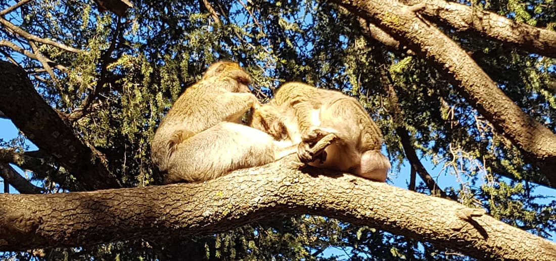 Just before the town of Azrou, we turned left onto the N13 and headed into the Cedar Forest where we would be wild camping for the night. We were hoping to catch sight of the endangered Barbary Macaque’s, one of the best known Old World monkey species. Oh boy, were we in for a treat! There was a whole troop of them at the parking lot and they were as tame as anything, taking fruit and peanuts right out of our hands! By the chubbiness of some of them, I think they spend their days here being fed by gawking tourists! They were really cute though.